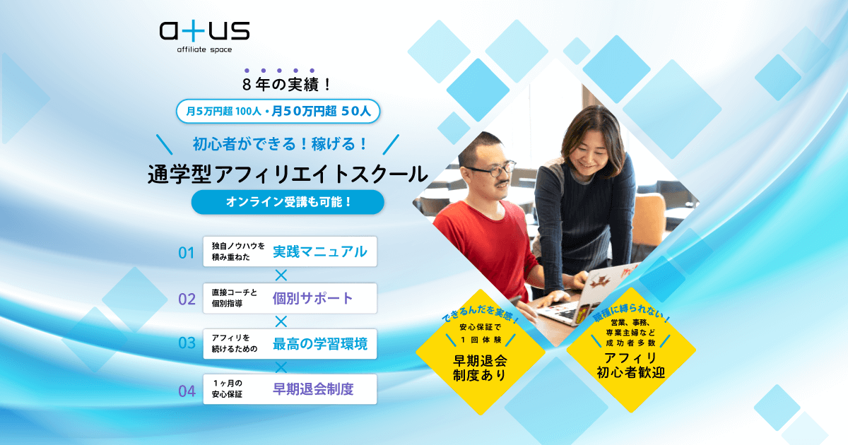 そんな中、初心者向けの通学型アフィリエイトスクールとして注目されているのが「atus(ええタス)」です。東京・大阪・オンラインに対応し、現役アフィリエイターから個別でサポートを受けられる点が特徴とされています。